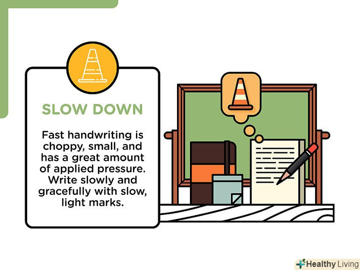Не поспішайте.швидкий почерк зазвичай характеризується нерівними і дрібними символами, вдавленими в папір. Напишіть неквапливо і витончено, залишаючи повільні, ясні лінії. Так у вас будуть виходити більш м'які штрихи і більш цілісні лінії і завитки. При цьому не напружуйте руку і не натискайте занадто сильно.- Пишіть так, ніби ви пишете по воді.