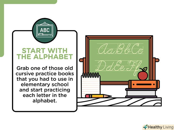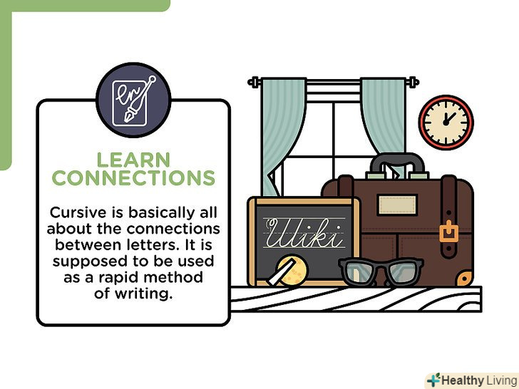 Навчіться з'єднувальним лініям.пропис - по суті, це з'єднання між буквами; вона використовується при швидкому листі. За фактом слово "курсив «(cursive — пропис) походить від латинського cursiva littera, що означає»побіжний почерк". Пам'ятайте про це, коли робите з'єднання між буквами.[5]- З'єднання — це "повітря" між буквами, коли ви відриваєте ручку при звичайному листі.