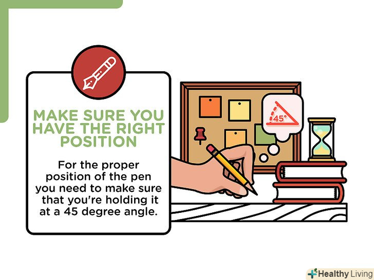 Переконайтеся, що ви правильно сидите.це означає, що ваші ноги повинні твердо стояти на підлозі, спина повинна бути прямою, і вам в загальному і цілому повинно бути комфортно. Ручку при цьому теж потрібно тримати правильно.[6]- Ручка повинна знаходитися між першими двома кісточками пальців, охоплена великим і вказівним пальцями. Вона повинна спиратися на середній палець.