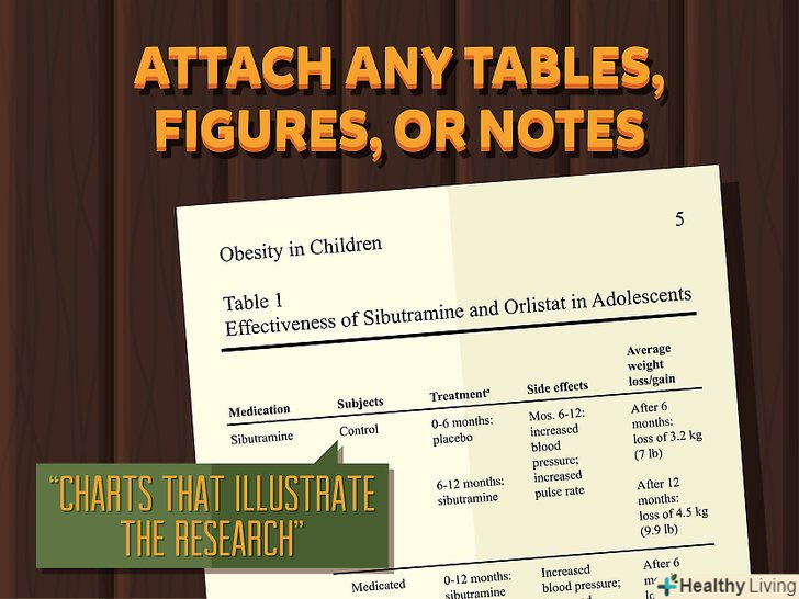 Приєднайте таблиці, графіки або коментарі.якщо є інформація, що підтверджує ваше дослідження, але вона займає занадто багато місця, помістіть її після основного тексту. Таблиці та ілюстрації також розміщуються після основного тексту.- Використовуйте виноски для довгих пояснень. Номер виноски вставляється відразу після відповідного слова/пропозиції в тексті. Розділ "виноски" вставляється в кінці публікації.
