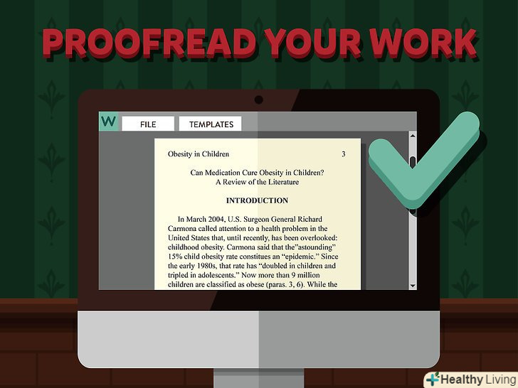 Перевірте свою роботу на наявність помилок.виконуючи роботу, стежте за кількома важливими моментами: логічність і ясність викладу, орфографія, пунктуація і граматика. Коли всі вимоги АПА по форматуванню будуть виконані, перегляньте текст роботи кілька разів, під час кожної перевірки звертайте увагу на якийсь певний пункт.- Зніміть з себе трохи напруги, попросивши друга виконати перевірку вашої роботи на пунктуацію, орфографію і граматику. Це дозволить зосередитися на форматуванні і змісті роботи.