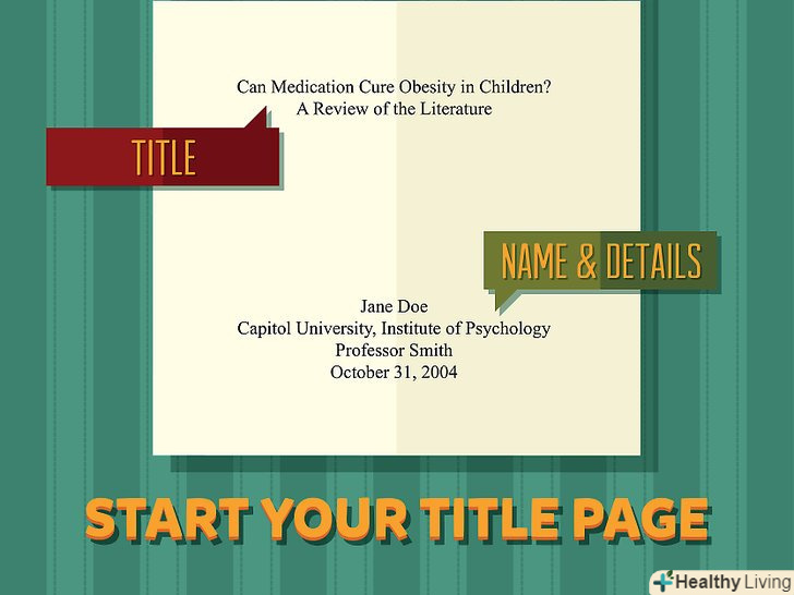 Почніть підготовку титульного аркуша.спочатку відформатуйте розташування заголовка по центру сторінки. Довжина заголовка не повинна перевищувати 12 слів. Натисніть "Введення" і надрукуйте своє ім'я. Під ім'ям розміщується назва вашого університету або іншого навчального закладу.- Для всього тексту використовується подвійний інтервал і вирівнювання по центру. Заголовок не повинен містити скорочень або вступних слів.