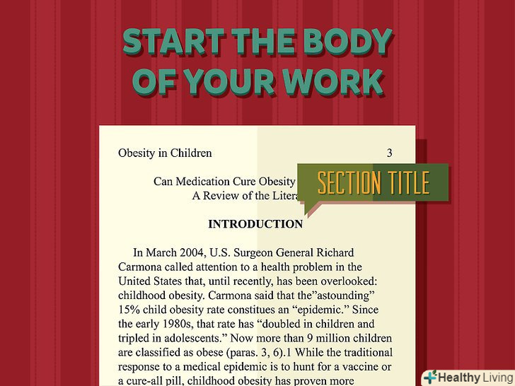 Почніть основний текст.по-суті, це і є ваша робота. Всі інші вимоги відносяться до форматування, якого потрібно дотримуватися. Цей розділ також повинен починатися з нової сторінки, використовується такий же колонтитул і триває нумерація сторінок. Ще раз надрукуйте назву свого дослідження і приступайте до роботи.- Як і в інших частинах роботи, для форматування тексту використовується подвійний інтервал з відступом першого рядка абзацу.[4]