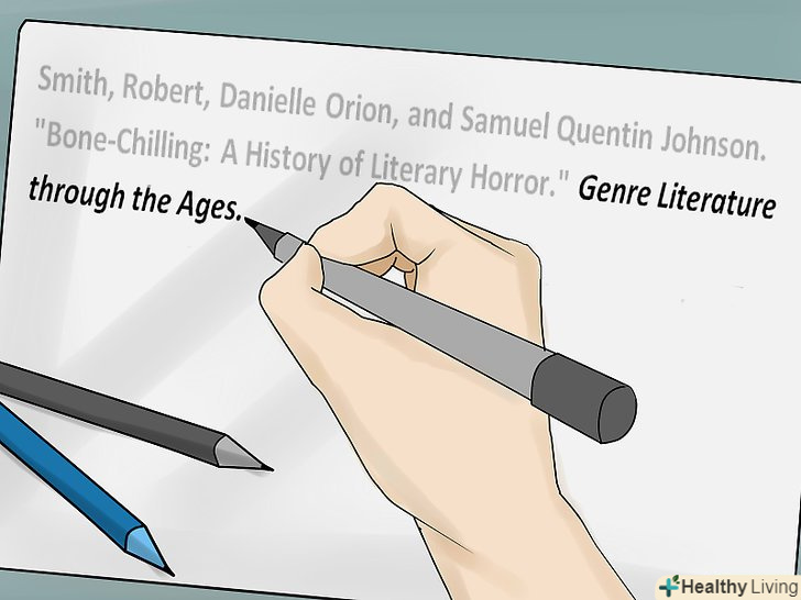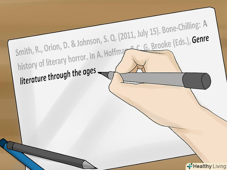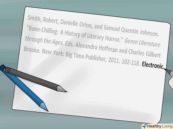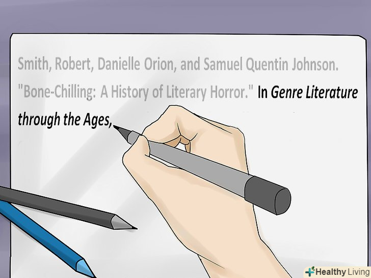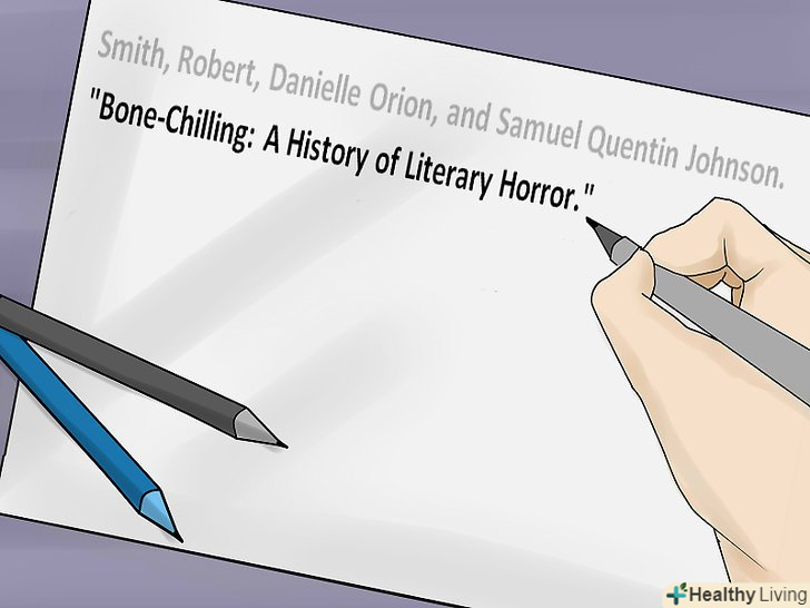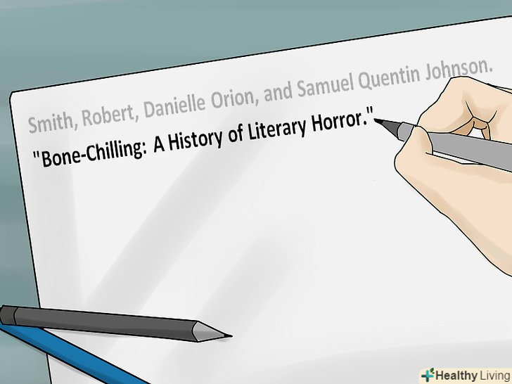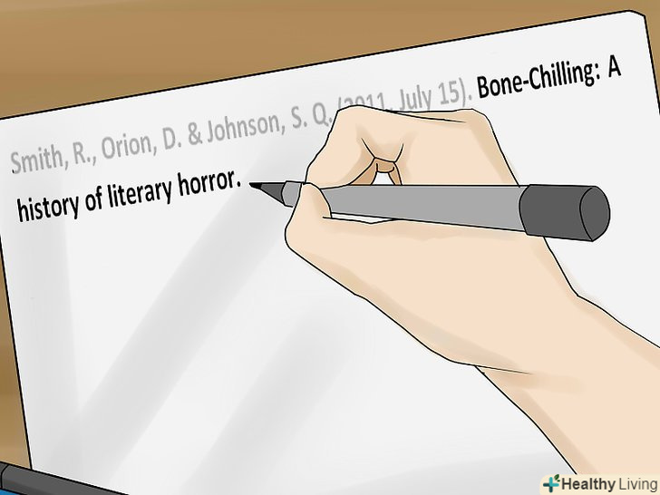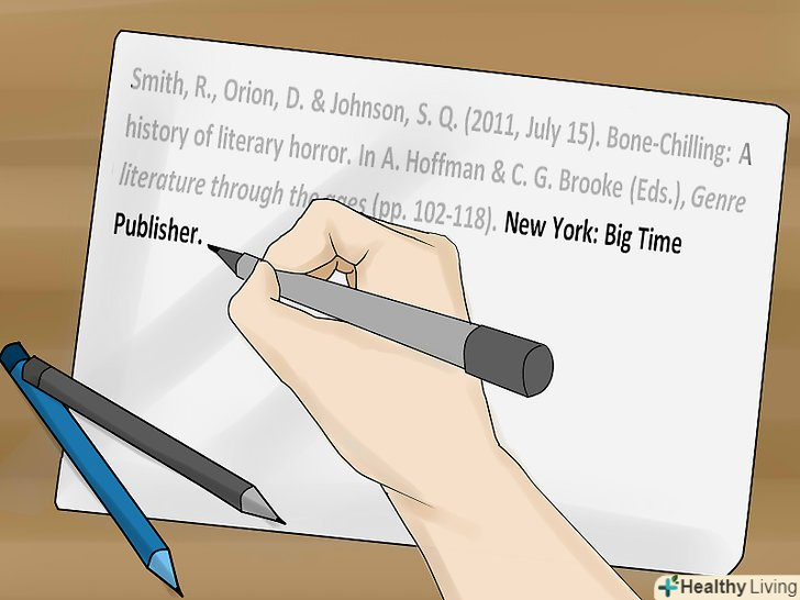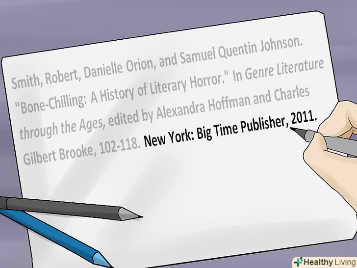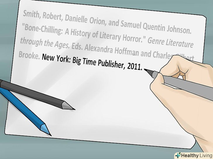 Вкажіть інформацію про публікацію.місто видання і назва видавництва пишуться через двокрапку. Після видавництва поставте кому і вкажіть Рік публікації. Якщо йде посилання, то візьміть пропозицію в дужки, а в списках літератури поставте крапку.- Роберт Сміт, Деніел Оріон і Семюель Квентін Джонсон, «холодні кістки: історія літературного жаху», влітературному стилі, що пережив століття, ред. Олександри Хоффман та ін. (Нью – Йорк: Видавництво Big Time, 2011),