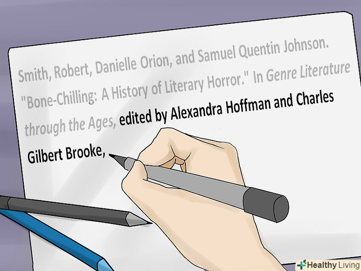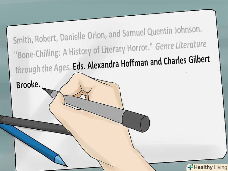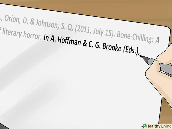 Також слід вказати імена редактора або редакторів.у виносках використовується абревіатура " ред»«, а в списках літератури – »під ред.". У виносках вказується тільки ім'я першого редактора, а решта – абревіатурою «і ін.». У списку літератури слід перерахувати всіх.- Роберт Сміт, Деніел Оріон і Семюель Квентін Джонсон, «холодні кістки: історія літературного жаху», влітературному стилі, що пережив століття, ред. Олександри Хоффман та ін.