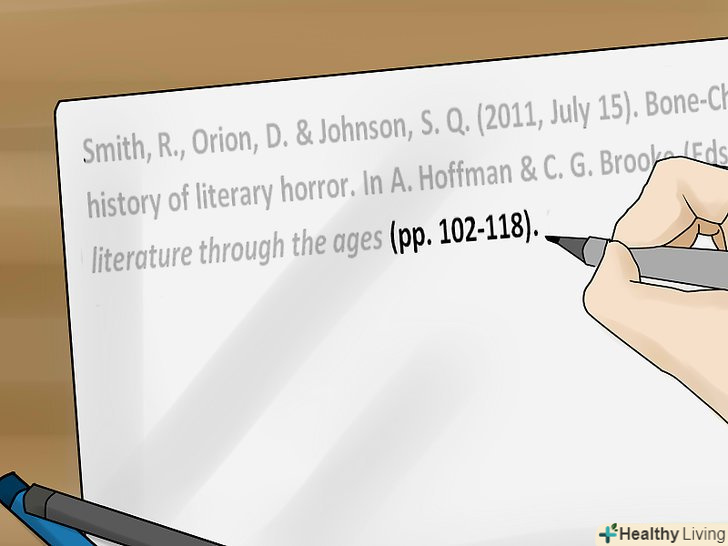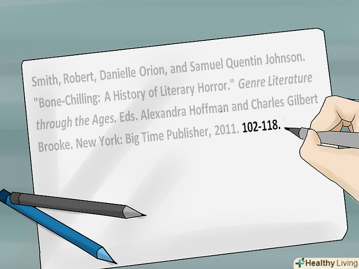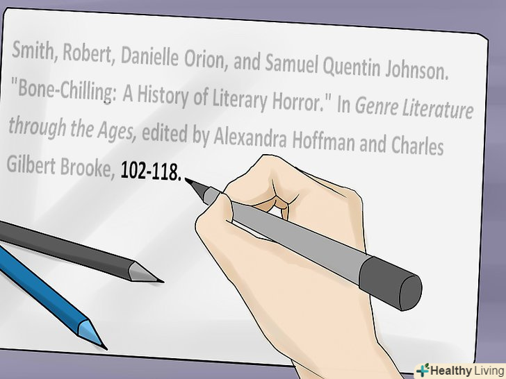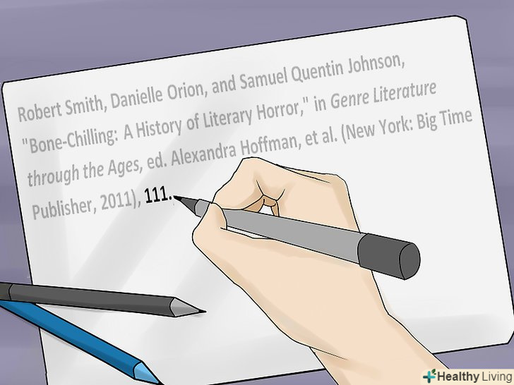 Якщо ви використовували цитати, то слід вказати номери сторінок. Це стосується тільки виносок і приміток. Вкажіть номер сторінки, з якої ви запозичили цитату, фразу або іншу інформацію. В кінці поставте крапку.- Роберт Сміт, Деніел Оріон і Семюель Квентін Джонсон, «холодні кістки: історія літературного жаху», влітературному стилі, що пережив століття, ред.Олександри Хоффман та ін. (Нью – Йорк: Видавництво Big Time, 2011), 111.