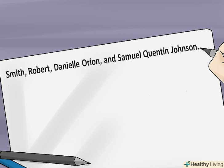 Вкажіть ім'я автора або авторів. прізвища та імена напишіть повністю, якщо це можливо. Додаткових авторів також слід вказати. Якщо їх більше трьох, то між іменами ставте коми, а між двома останніми – «і». Не забувайте про точки.- Доу, Джон.