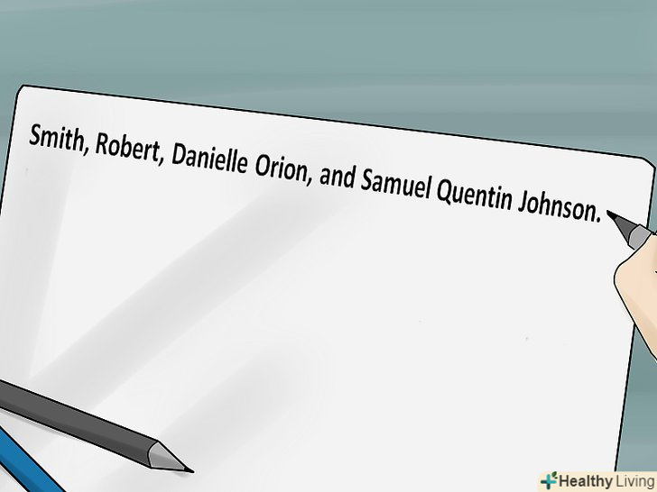 Вкажіть автора або авторів есе. у виносках і примітках ім'я автора пишеться у форматі ім'я-прізвище. У списку використаної літератури спочатку вкажіть прізвище, потім-ім'я. У виносках це робиться через кому, в списку літератури – ставляться крапки.- Роберт Сміт, Деніел Оріон і Семюель Квентін Джонсон,