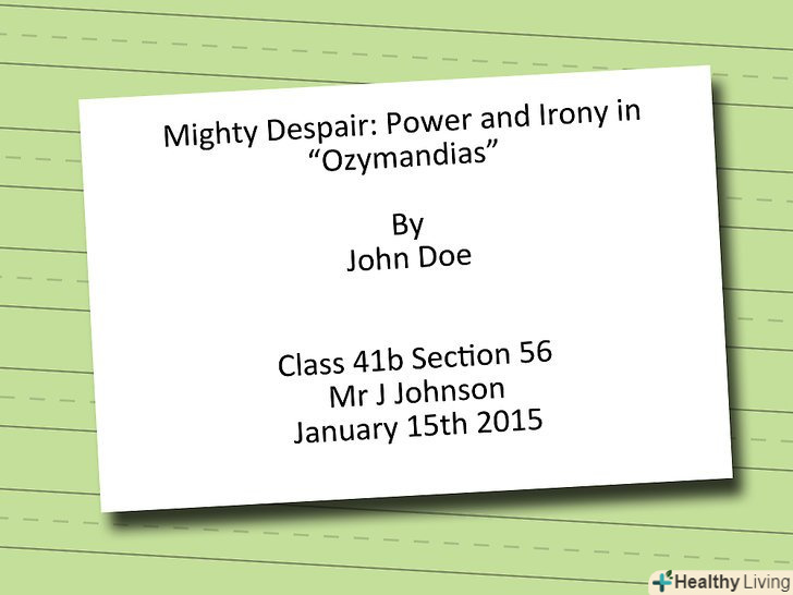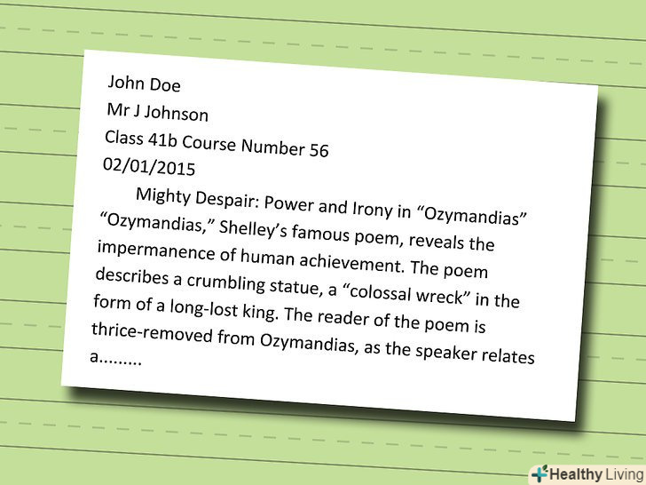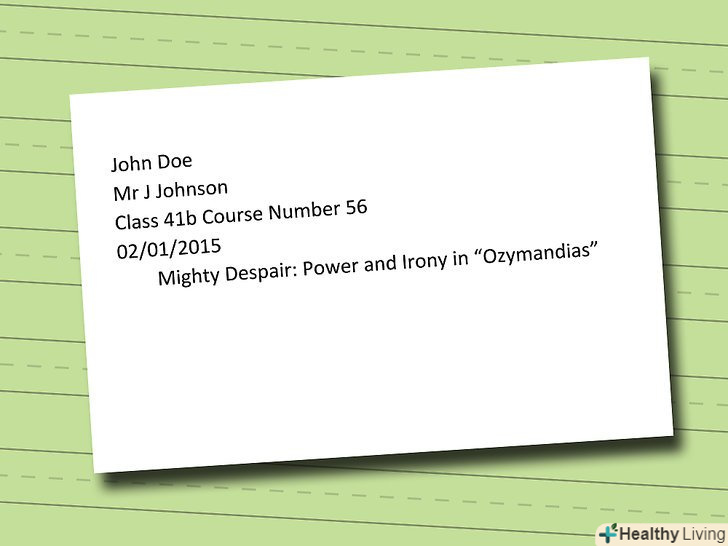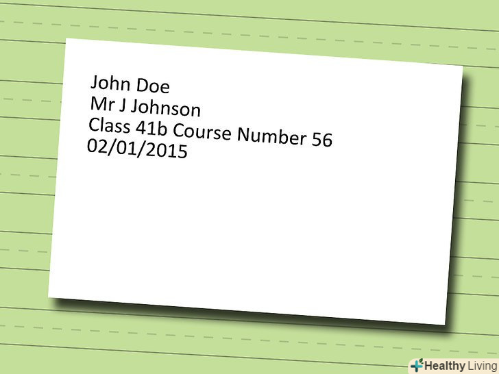 Напишіть заголовок у верхньому лівому куті. Заголовок повинен містити ту ж інформацію, що і титулярний аркуш, якщо він використовується. Вкажіть ваше повне ім'я, ім'я викладача, назву курсу і дату здачі завдання.- Напишіть ваше ім'я на першому рядку у форматіІм'я прізвище.