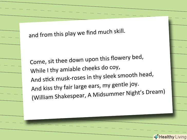 Форматування цитати всередині рядка. більшість цитат у вашій роботі будуть "всередині рядка", що означає, що вони не вимагають особливого форматування і можуть бути розглянуті як звичайний текст.- Завжди включайте цитати в більш розгорнуте речення. Ніколи на вставляйте окремі цитати, тобто цитати, які написані самі по собі, без будь-якого введення з Вашого боку.