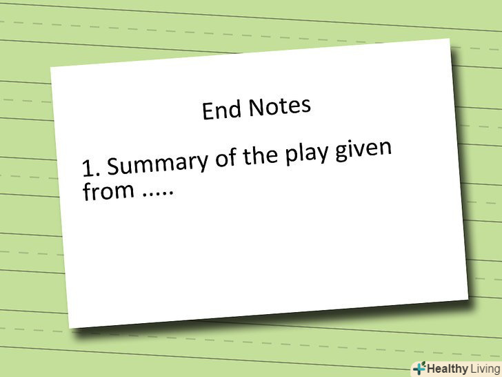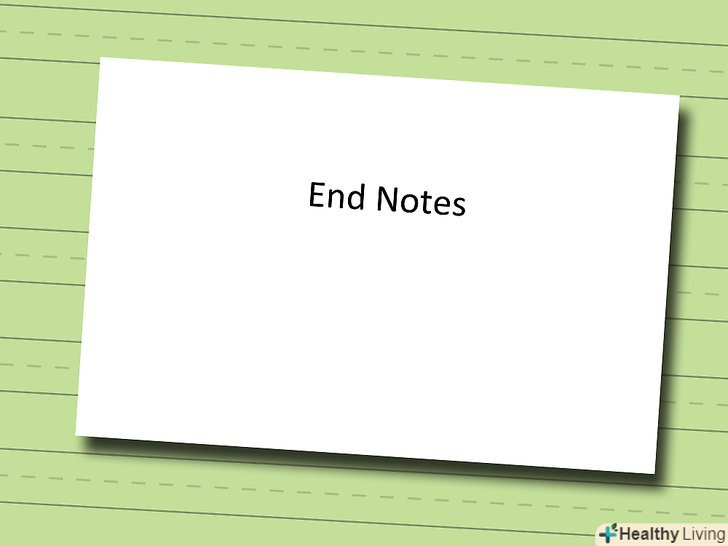 Заголовок "кінцеві виноски" слід вирівняти по центру. не виділяйте його курсивом, жирним або підкресленим шрифтом.[5]- Якщо у вашій роботі містяться кінцеві виноски, вони повинні бути вказані на окремій сторінці кінцевих виносок, яка розташовується після закінчення тексту самої роботи. Не плутайте кінцеві виноски зі звичайними виносками, які розміщуються в кінці сторінки, на якій вони з'являються.