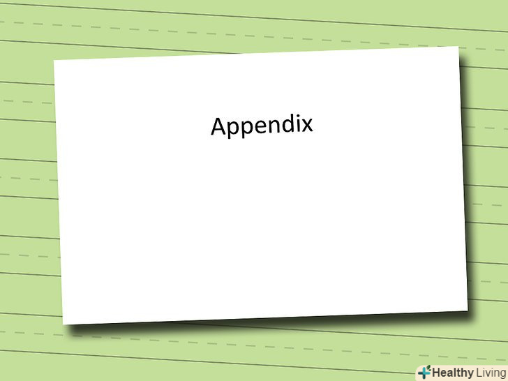 Додайте релевантну, але необов'язкову інформацію. зміст програми має бути пов'язано з вмістом вашої роботи, але не повинно включати вирішальну або істотну інформацію для вашого аргументу.- Додаток є хорошим способом включити пов'язану інформацію, не відволікаючи уваги від головного аргументу вашої роботи.