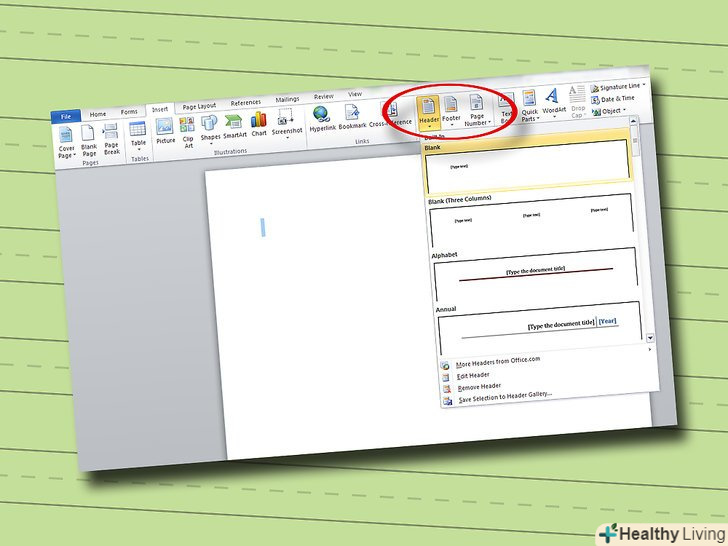 Встановіть верхній колонтитул. Верхній колонтитул буде відображатися нагорі кожної сторінки в статичному положенні. Текст верхнього колонтитула повинен включати ваше прізвище та номер поточної сторінки і відображатися у верхньому правому куті сторінки.- Налаштування колонтитулів можна зазвичай знайти під меню "Вид"або " Вставка". В опціях налаштувань колонтитулів, встановіть відображення номерів сторінок в правому верхньому куті сторінок, а потім впишіть ваше прізвище в з'явився верхній колонтитул.