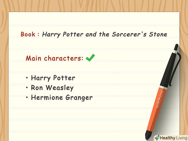 Робіть нотатки, коли читаєте.тримайте під рукою блокнот, щоб записувати свої думки під час читання. Вам буде набагато легше писати свій виклад, якщо ви будете робити записи по ходу, а не намагатися згадати все в кінці.[1]- Непогано мати під рукою кілька аркушів паперу для записів. Один може служити для загальних вражень і думок, інший — для списку героїв і подій, а ще один — для запису головних тем і ідей, представлених в книзі.