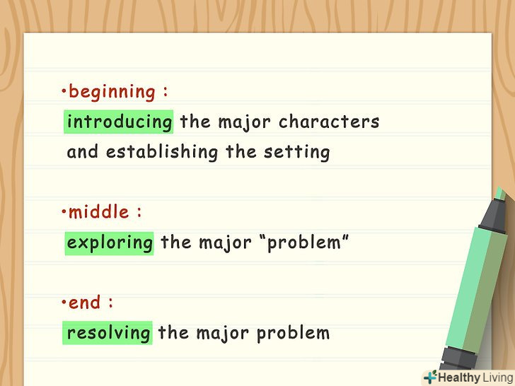 Розділіть книгу на секції.найпростіше поділити книгу на три частини, щоб не перевантажувати себе — в кожній історії є початок, середина і кінець. Організуйте свої записи згідно з цим принципом.[3]- Основний фокус першої секції-представлення головних дійових осіб і опис обстановки.