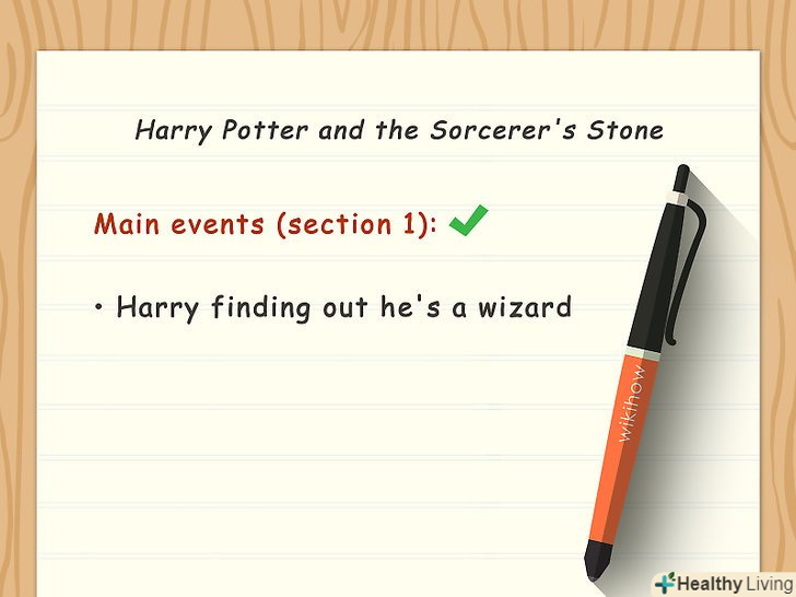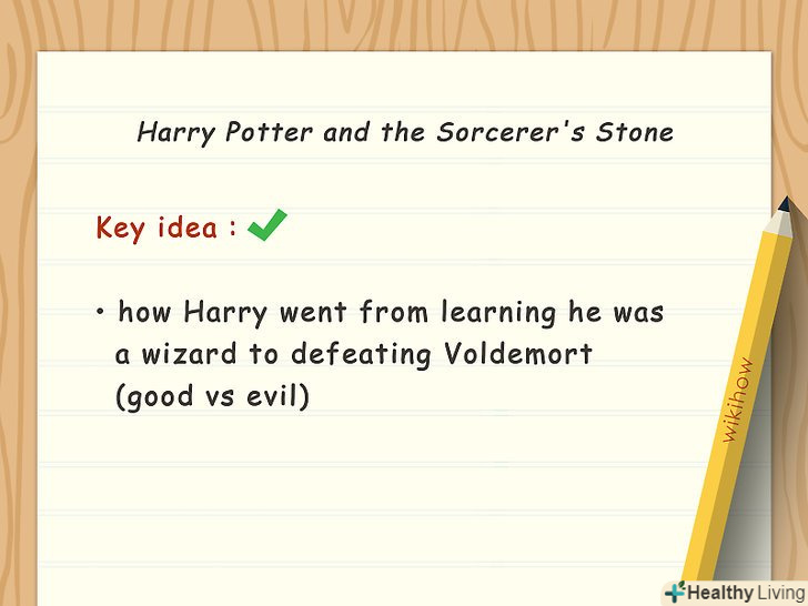 Не відволікайтеся на незначні деталі.при написанні короткого викладу, не варто включати несуттєві деталі про другорядних персонажах, всілякі описи або незначні відгалуження сюжету. Це не означає, що треба випускати ці частини книги по ходу читання, але не варто зациклюватися на них при складанні конспекту.[13]
