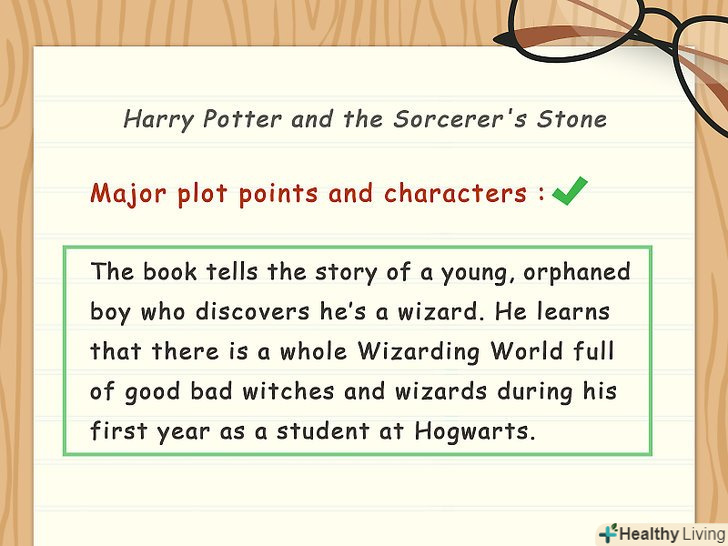Опишіть основні сюжетні лінії і героїв.вкажіть назву твору, автора і коротко викладіть, про що ця книга. Це буде вашим введенням (кілька пропозицій).[7]- Можна написати приблизно так: "Книга Дж. К. Роулінг "Гаррі Поттер і філософський камінь" розповідає історію маленького хлопчика-сироти, який дізнався, що він насправді чарівник. Під час першого року навчання в школі чарівників Хогвартс перед ним відкривається невідомий досі світ магів, населений хорошими і поганими відьмами і чарівниками".