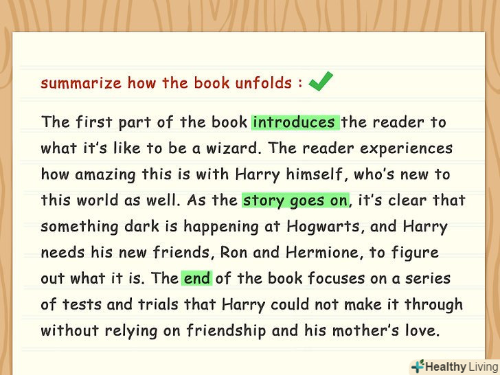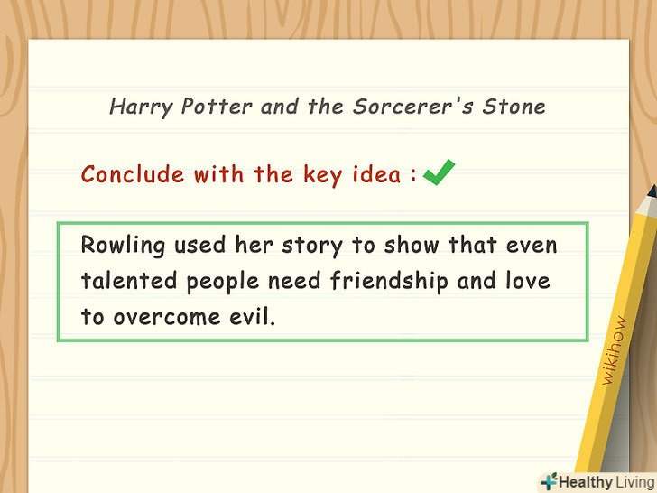 У висновку необхідно зробити огляд основних ідей книги. Висловіть свою думку щодо моралі цього твору. Використовуйте свої начерки, щоб виявити основну тему. Ця пропозиція і має підвести підсумок у вашому резюме.[8]- Наприклад:"Роулінг своїм романом показала, що навіть вельми талановитим людям потрібна дружба і любов, щоб подолати зло".