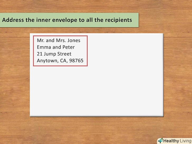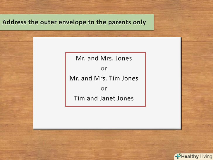 Адресуйте зовнішній конверт тільки батькам.деякі види листів надають особливого значення проханню про відповідь від одержувача. У таких ситуаціях, як ця, невеликий, як правило, попередньо адресований конверт для відповіді часто включається всередині зовнішнього конверта. Якщо ви посилаєте лист на зразок цього, варто відзначити, що зовнішні і внутрішні конверти зазвичай адресуються трохи інакше, коли одержувачем є вся сім'я. Для початку, адресуйте зовнішній конверт (той, в якому містяться зміст листа і другий конверт) тільки з іменами батьків або главами сім'ї.- Для зовнішнього конверта напишіть імена батьків, як описано в попередньому розділі. Наприклад,якщо ви запрошуєте всю сім'ю Jones на своє весілля, для зовнішнього конверта ви б написали тільки імена батьків :Mr. and Mrs. Jones,Mr. and Mrs. Tim Jones, або Tim and Janet Jones.
