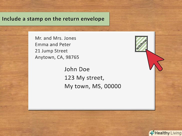 Адресуйте внутрішній конвертвсім одержувачам.для внутрішнього конверта правила дещо відрізняються. Якщо ви запитуєте відповідь від кожного члена сім'ї (наприклад, якщо ви запрошуєте всю сім'ю на своє весілля), напишіть імена батьків у першому рядку адреси та імена дітей під нею у другому рядку. Якщо, однак, ви запитуєте тільки відповідь від батьків, Ви б тільки написали їх імена в першому рядку адреси, потім перейдіть до поштової адреси і так далі.- Зверніть увагу, що адреси внутрішнього конверта відносяться до йогозворотною адресою. Очевидно, що основна адреса, яка розповідає, куди конверт відправляється, буде вашим власним (або відповідного агентства, бізнесу, абонентської скриньки і т.д.). Таким чином, їх відповідь буде відправлений в потрібне місце.