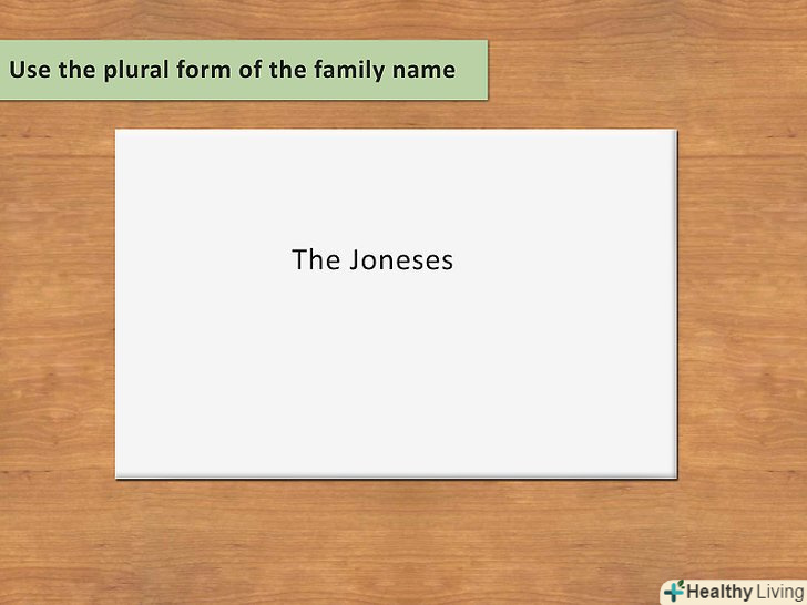Використовуйте форму множини для Прізвища.в якості альтернативи, зазначеної вище, також прийнятно використовувати просту форму множини для Прізвища сім'ї в якості першого рядка в адресі на конверті. У цьому випадку, прізвища у множині завжди передує слово "The", так що кінцевий результат має вигляд: "The Smiths", "The Garcias", і так далі.- Не потрапляйте в пастку з використанням апострофа тут. Апострофи використовуються для вираження володіння, а не щоб зробити слово у множині, так що ви не повинні використовувати їх у формі множини прізвища сім'ї. Більшості прізвищ просто потрібно закінчення - S в кінці для формування множини (наприклад, Thompsons, Lincolns). Проте, до прізвищ, які закінчуються на звук "s"," sh", або "x"", як правило, потрібно додати -es в кінці (наприклад, Rosses, Foxes, Welshes).