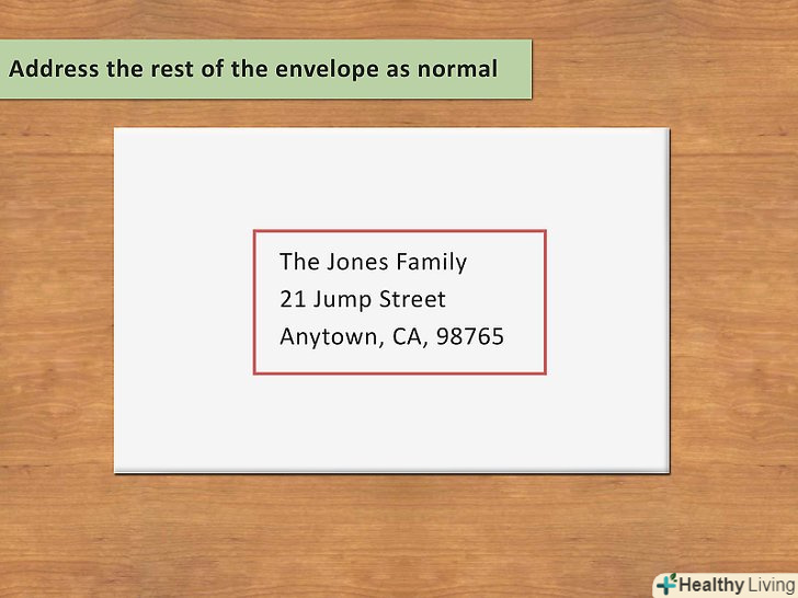 Заповніть адресу РЕШТИ конверта, як звичайно.незалежно від методу, який використовується для першого рядка адреси конверта, решта адреси записується так, як це було б для будь-якого іншого листа. Під першим рядком, що містить прізвище, напишіть номер вулиці або абонентський ящик, потім на наступному рядку напишіть місто, штат/провінція, поштовий індекс, і так далі. Якщо підписувати конверт на місці рівні, напишіть назву країни нижче в окремому четвертому рядку. Напишіть свою зворотну адресу за тією ж формою в лівому верхньому кутку конверта. Для отримання додаткової інформації, читайте статтю "Як написати адресу на конверті".- Наприклад, у нашому прикладі з сім'єю Jones наша остаточна адреса може виглядати приблизно так: