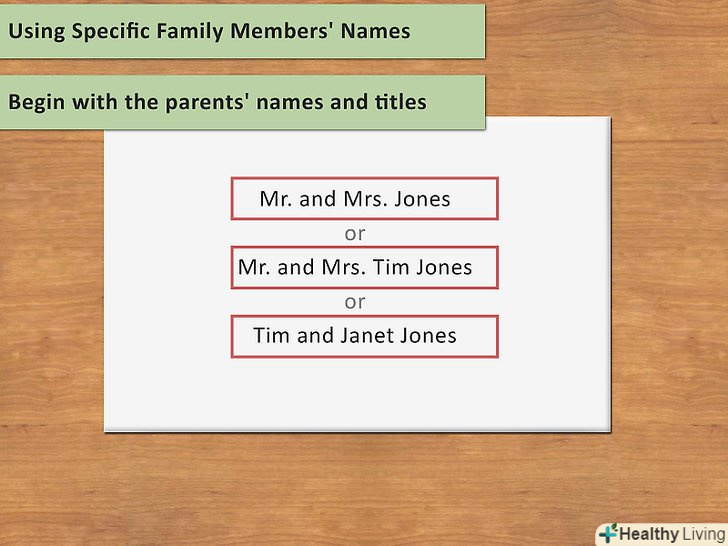Почніть з Імен батьків і звань. при адресації конверта всій родині, на додаток до використання Прізвища для позначення всіх членів сім'ї ви можете також назвати деяких або всіх з них окремо. Цей метод корисний для листів, таких як весільні запрошення, в якому важливо повідомити, для кого конкретно лист. Для початку, в першому рядку вашої адреси напишіть імена батьків. У більшості випадків вам потрібно буде використовувати їх відповідні титули(Mr. і Mrs-завжди надійно, в той час такі титули, як "Dr.", "Judge", і так далі, як правило, необов'язкові, крім формальних або професійних контекстів).- Наприклад, якщо ми запрошуємо сім'ю Jones на новосілля, ми б почали з написання імен батьків у першому рядку:Mr. and Mrs. Jones.