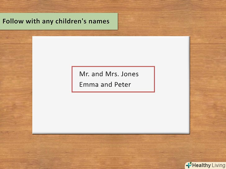 Вкажіть будь-які дитячі імена.у наступному рядку перерахуйте імена дітей, у віці до 18 і які живуть на утриманні батьків. Ви можете надати прізвище один раз в кінці списку імен дітей (наприклад, David, Chelsea and Gabriela Richardson),), або ви можете залишити їх повністю (наприклад, David, Chelsea, and Gabriela). Якщо ви знаєте, вік дітей, перерахуйте їх від старших до молодших.- Наприклад, в нашому прикладі про запрошення на вечірку, ми б написали імена дітей в сім'ї нижче імен батьків так:Emma and Peter.Це означає, що перші два рядки нашої адреси будуть виглядати приблизно так: