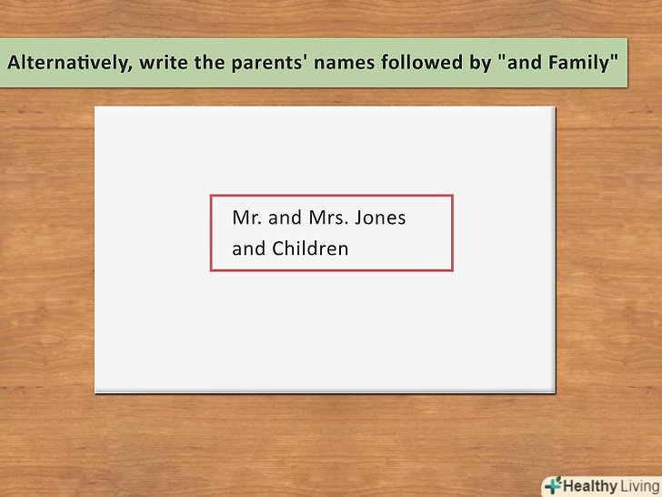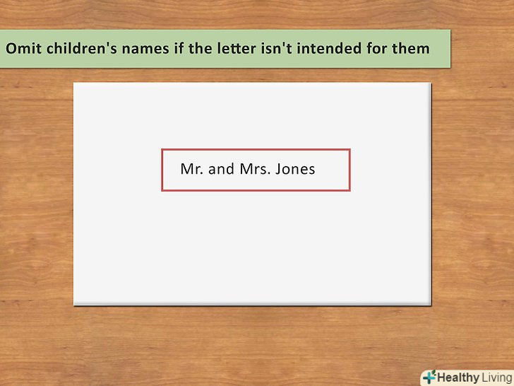 Опустіть імена дітей, якщо лист не призначений для них.наведені вище приклади припускають, що лист призначений як для батьків, так і дітей в сім'ї. Якщо це не так, вкажіть відповідних одержувачів в першому рядку, потім відразу приступайте до поштової адреси, не використовуючи другий рядок для перерахування додаткових членів сім'ї.- Якщо, наприклад, ми б хотіли запросити тільки батьків сім'ї Jones на нашу вечірку, то ми б використовували стандартне зверненняMr. and Mrs. Jones, не називаючи їх дітей.