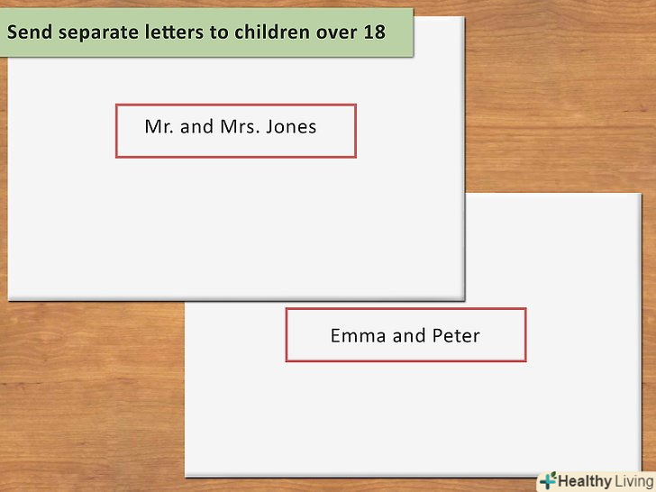 Надсилайте окремі листи дітям старше 18 років.якщо в сім'ї є діти старше 18 (або традиційного віку для повноліття в місці проживання одержувача), надішліть цим дітям свій особистий, окремий лист на додаток до того, який ви посилаєте їх батькам. Отримання вашого особистого листа є ознакою дорослості. Хоча це дуже незначно, але може бути сприйнято як щось образливе, наприклад, бути запрошеним на вечірку через лист, адресований батькам.