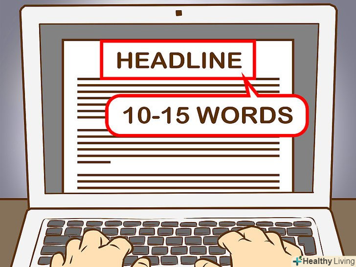 Придумайте заголовок.видання може придумати свій заголовок, але якщо ви хочете, щоб він відображав зміст статті, то сформулюйте відповідний варіант. Заголовок повинен бути коротким і по суті. Довжина заголовка не повинна перевищувати 10-15 слів. Він повинен виражати дію і демонструвати важливість історії, привертати увагу читача і змушувати його ознайомитися зі статтею.[6]- Якщо ви хочете повідомити трохи більше відомостей, використовуйте підзаголовок, який повинен продовжувати і розвивати ідею заголовка.