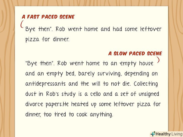 Пишіть в зручному для вас темпі.немає сенсу вичавлювати з себе той чи інший обсяг тексту, незалежно від обставин. Пишіть так, як вам буде зручніше. Знову ж таки, грань тонка, і якщо ви описуєте власний досвід, то буде мати сенс час від часу перемикатися з деталей на події, а потім назад.- Епізоди розповіді-це як перлини в намисто: вони повинні бути належної форми, а на намисто їх повинно бути в міру. Так, читач читає саме епізоди, але саме епізоди повинні вести читача по ходу розповіді.[3]
