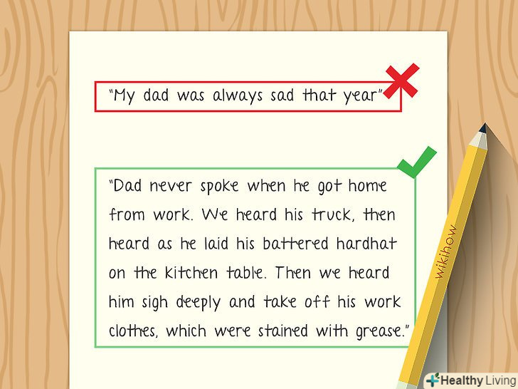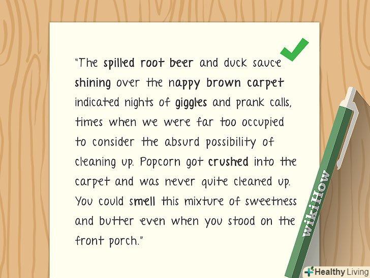 Використовуйте власні почуття. Все. Відразу. Щоб деталі поставали перед читачами у всій повноті, обсязі і красі. Виникла проблема з описом чогось? Звертайтеся до почуттів.- Зробіть невелику таблицю з п'ятьма колонками - для запахів, звуків, виду, відчуття і смаку. Якщо щось зазвичай описується через одне почуття, це зовсім не означає, що ви не можете продовжити описовий ряд. Ви можете почути і відчути дощ, це так. Але ви ще можете відчути його запах. Загалом, продовжувати можна завжди.