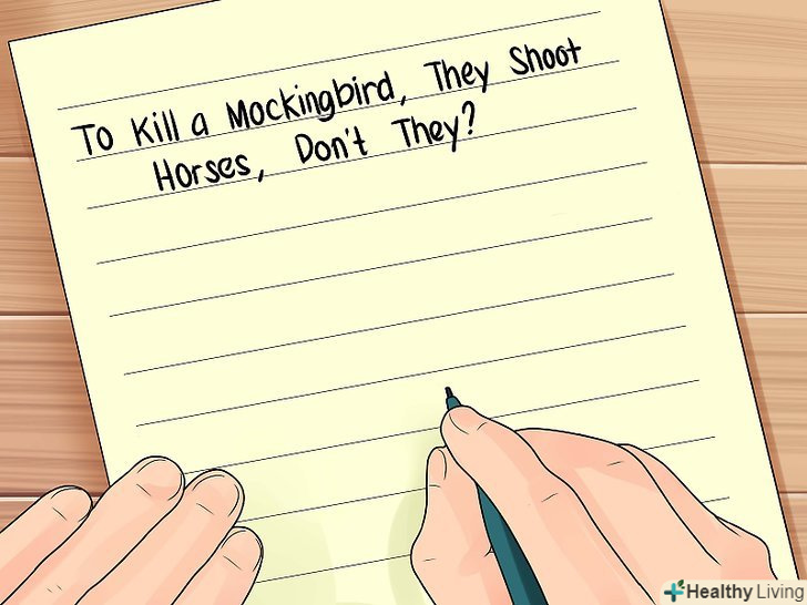 Назвіть книгу значущою рядком з неї.якщо у вашій історії є особливо витончений або оригінальний оборот або фраза, що відображають важливий елемент подій або тему, можете використовувати в якості назви їх або варіації на їх тему.- Наприклад, назви "Вбити пересмішника", " Загнаних коней пристрілюють, чи не так?"або" Несплячі в Сіетлі " засновані на рядках з цих творів.[4]