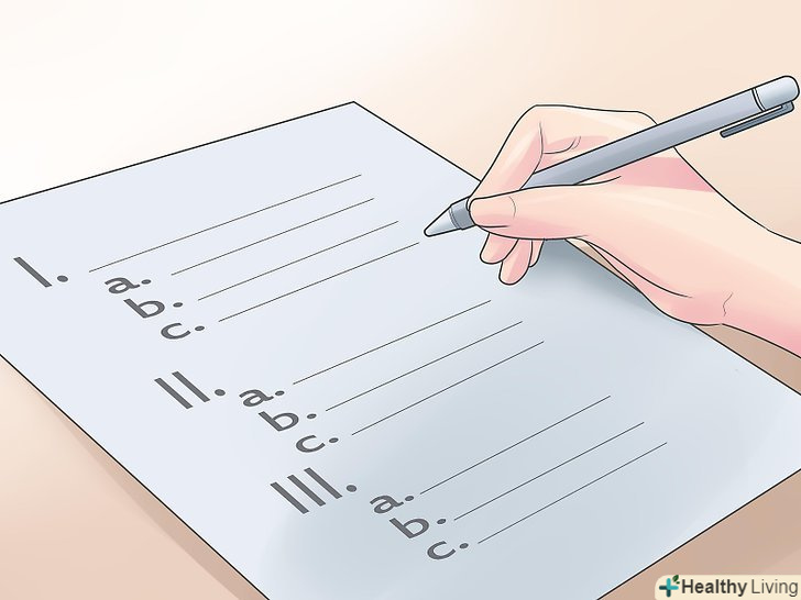 За бажанням намітьте структуру есе.іноді на етапі вступу важливо подумати про те, як саме ви плануєте досягти своєї мети. Може бути корисно розбити есе на окремі чіткі частини, тому що так читачеві буде простіше засвоїти текст. Якщо ви студент або учень, вам ця навичка теж стане в нагоді, тому що багато педагогів вимагають цього. Однак перераховувати всі пункти твори в есе не варто. Буває і так, особливо якщо есе написано простою мовою про щось несерйозне, що перерахування частин робить текст машинним. Швидше за все, це відлякає читача, тому що перед ним відразу виявиться дуже багато інформації.[5]- У випадку з есе про ожиріння можна продовжити так:»У цьому есе йдеться про три проблеми, пов'язані зі здоров'ям: зростаюча доступність висококалорійної їжі, нестача фізичних вправ і набирає обертів Популярність нерухомих способів проведення дозвілля". Якщо ваш твір буде написано зрозуміло і по справі, перерахування основних моментів буде не найгіршою ідеєю, оскільки це допоможе читачеві відразу зрозуміти, як основний текст есе пов'язаний зі вступом. у той же час в творі про канікули так робити не варто. Оскільки ми вже вирішили, що цей твір буде легким і ненав'язливим, було б дивно написати щось на зразок такого: «дослідивши міське життя в столиці Сан-Хосе і сільське життя в джунглях Тортугеро, я змінився як людина». Це не жахливе пропозиція, але воно погано поєднується з усіма пропозиціями, що передують йому, тому що воно володіє жорсткою структурою, яка тут не потрібна.