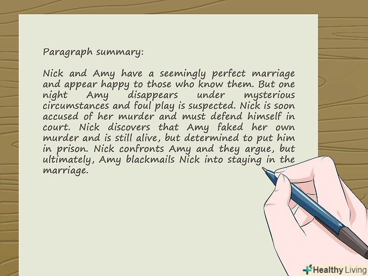 Напишіть короткий зміст довжиною в один абзац.після того як ви придумаєте короткий зміст в одне речення, розширте його до повного абзацу, який описує обстановку, основні події, кульмінацію і закінчення історії. Можна використовувати структуру "три лиха плюс закінчення", де в історії відбуваються три погані речі, які призводять до кульмінації. Сенс полягає в тому, що положення головного героя погіршується, поки він не досягне кульмінації, а потім закінчення або розв'язки.[12]- Абзац повинен складатися з п'яти речень. Одна пропозиція буде описувати обстановку. За однією пропозицією буде відведено кожному з трьох лих. І одне, заключне речення, буде описувати кінцівку.