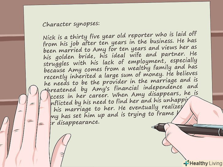 Напишіть коротку характеристику персонажів.як тільки ви розберетеся з коротким змістом, зосередьтеся на тому, щоб оживити персонажів. Придумайте сюжетну лінію для кожного головного героя, відзначаючи важливі характеристики (ім'я, мотивація, мета, конфлікт і фінальне прозріння). Сюжетна лінія кожного персонажа повинна бути довжиною приблизно в один абзац.[13]- Коротка характеристика персонажа необов'язково повинна бути ідеальною або відшліфованою. Швидше за все, ви повернетеся назад і підправите її пізніше або відхиліться від неї, коли почнете прописувати сцени роману. Однак це як мінімум допоможе вам краще зрозуміти своїх героїв і те, як вони вписуються в історію.