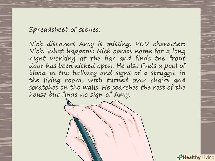 Складіть таблицю сцен.після того, як ви придумаєте короткі характеристики для кожного головного героя, а також напишете короткий зміст в один абзац, спробуйте розширити його сценами за допомогою персонажів. Список сцен допоможе вам краще зрозуміти загальний сюжет історії.- Щоб упорядкувати сцени і спростити собі завдання, використовуйте програму для роботи з електронними таблицями. Залежно від довжини історії, сцен може бути як 50, так і більше 100. Створіть два стовпці в електронній таблиці: один для головного персонажа в сцені, а інший — для короткого пояснення того, що відбувається. Потім перерахуйте сцени одну за одною, використовуючи короткий зміст в якості орієнтира.