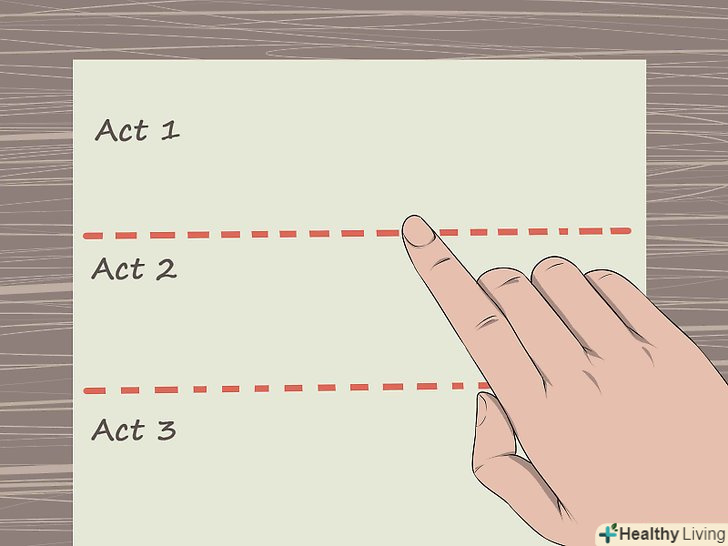 Розділіть план на три акта. щоб створити план сюжету для тексту, який ви вивчаєте в школі або університеті, розділіть цей план на три акти. За допомогою такої структури можна розбити більшість романів і книг.[14]- Використовуйте документ word або аркуш паперу для створення трьох окремих розділів, названих як "Акт 1», «Акт 2»і "Акт 3".