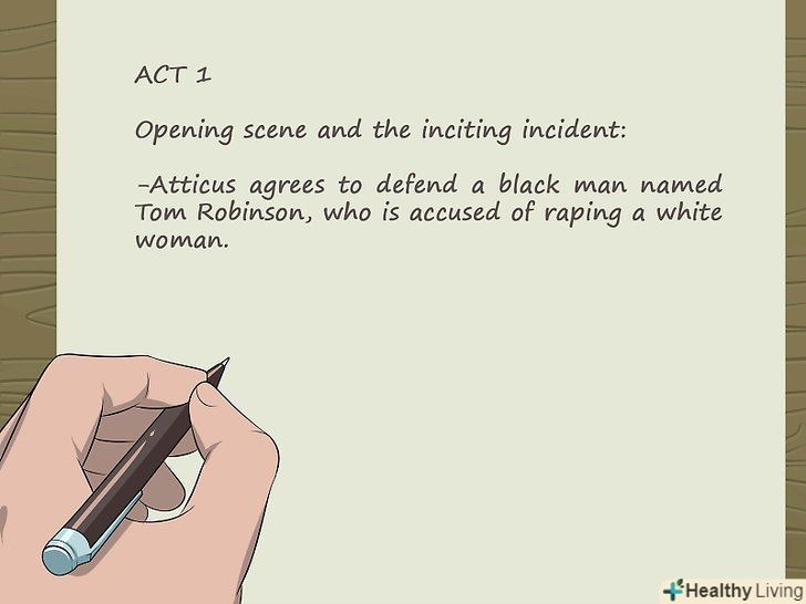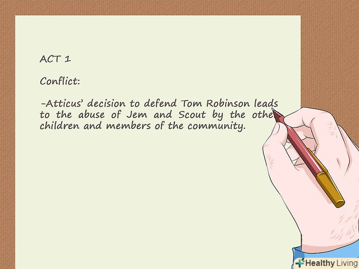 Опишіть основну проблему або конфлікт.заключна частина "акту 1" буде присвячена основній проблемі або конфлікту в романі. Це найбільша перешкода, з яким доведеться зіткнутися головному герою. Проблема або конфлікт підніме ставки в історії і змусить головного героя прийняти рішення або діяти певним чином. Як правило, саме зав'язка призводить до основної проблеми або конфлікту.[16]- Наприклад, в книзі Харпер Лі» Вбити пересмішника " основний конфлікт виникає в зав'язці, оскільки рішення Аттікуса захищати Тома Робінсона призводить до того, що інші діти і члени спільноти проявляють жорстоке ставлення до Джему і Скаут.