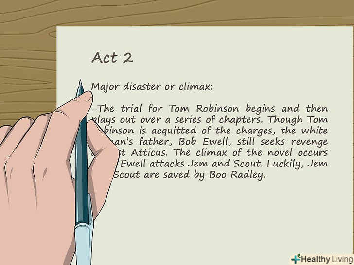 Напишіть короткий зміст головної катастрофи або кульмінації. "Акт 2" зазвичай вибудовується до найбільшої катастрофи або кульмінації роману. Катастрофа або кульмінація часто відбувається приблизно на ¾ шляху в книзі або на 75% шляху в історії. Можливо, ви відзначите кілька невеликих інцидентів, які відбуваються в розвитку дії, що веде до кульмінації.[17]- Наприклад, в книзі Харпер Лі "Вбити пересмішника" розвиток дії відбувається, коли починається суд над Томом Робінсоном, а потім воно розігрується протягом декількох глав. Незважаючи на те що Том Робінсон був виправданий за всіма пунктами звинувачення, батько білої жінки, Боб Юелл, все ще намагається помститися Аттікусу. Кульмінація роману настає, коли Юелл нападає на Джема і Скаут. На щастя, Джем і Скаут рятує Бу Редлі.