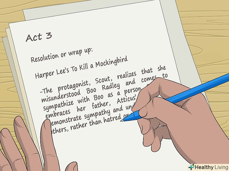 Опишіть розв'язку або висновок.Заключний акт роману, "Акт 3", міститиме розв'язку історії. Вона позначає кінець шляху головного героя. Як правило, він знаходить нове розуміння або усвідомлення в порівнянні з початком роману.[18]- Наприклад, в книзі Харпер Лі» Вбити пересмішника " головна героїня, Скаут, усвідомлює, що вона помилялася в судженнях про Бу Редлі, і починає співпереживати Бу як людині. Вона також приймає пораду свого батька, Аттікуса, демонструвати до оточуючих співпереживання і розуміння, а не ненависть або упередження.