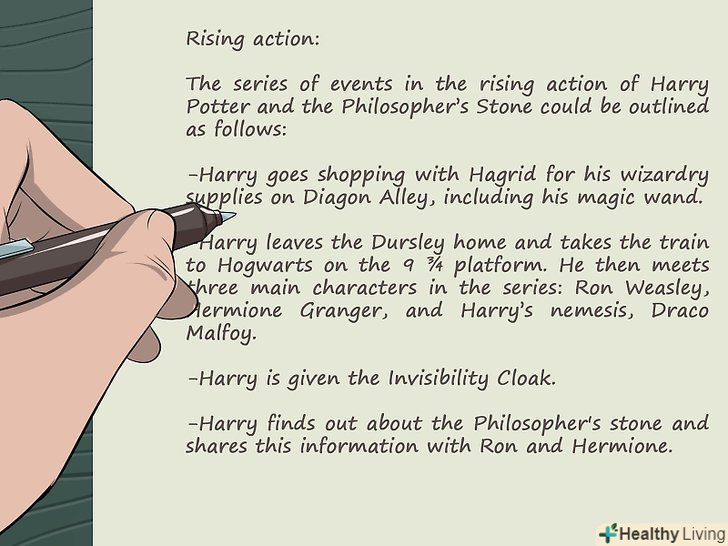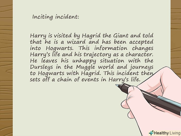 Визначте зав'язку.Зав'язкою буде подія, яка змінить хід життя головного героя. Воно повинно застати головного героя зненацька і бути пов'язаним з ризиком. Найчастіше зав'язка починається відразу після знайомства читача з експозицією.[4][5]- Наприклад, в книзі "Гаррі Поттер і філософський камінь" зав'язка настає в той момент, коли Гаррі відвідує велетень Хагрід і повідомляє, що Гаррі — чарівник і що його прийняли в Хогвартс. Ця інформація змінює життя Гаррі і його шлях розвитку як персонажа. Він залишає своє нещасливе життя у Дурслів у світі маглів і відправляється в Хогвартс разом з Хагрідом. Цей епізод запускає ланцюг подій у житті Гаррі.