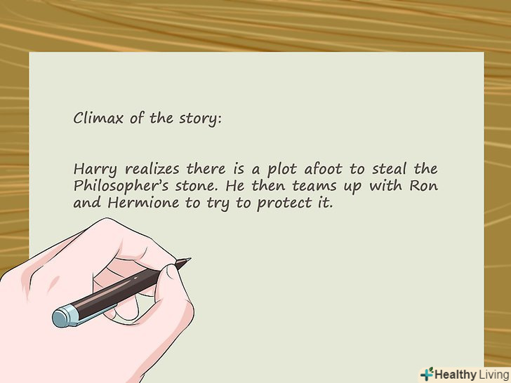 Напишіть кульмінацію історії.кульмінація історії-це найвища точка, яка повинна відчуватися як найважливіший момент для головного героя. Це може бути серйозна невдача або виклик, з яким йому доводиться мати справу, або важливе рішення, яке він повинен прийняти. Часто кульмінацією є зовнішня подія, яку головний герой повинен пережити, щоб дістатися до падаючого дії і розв'язки.[7]- Наприклад, у книзі "Гаррі Поттер і філософський камінь" кульмінація історії настає, коли Гаррі розуміє, що готується змова з метою вкрасти філософський камінь. Потім Гаррі об'єднується з Роном і Герміоною, щоб спробувати захистити камінь.