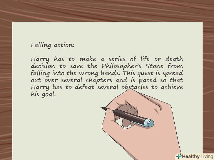 Визначте падаючу дію.як правило, Падаюча дія є найбільш насиченою частиною історії, де події розвиваються з величезною швидкістю, щоб досягти розв'язки. Читач повинен перебувати в напрузі протягом усього падаючого дії, щоб дізнатися, як головний герой розбереться з кульмінацією історії.[8]- Падіння дії може відбуватися протягом декількох глав, особливо в разі великої кульмінації. Воно може відчуватися як швидко розвивається подорож, яка призводить персонажів до розв'язки історії.