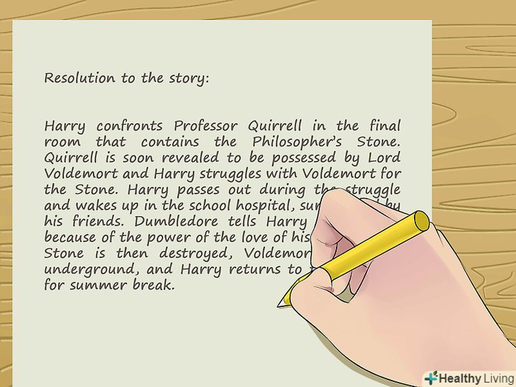 Придумайте розв'язку історії.Розв'язку іноді називають висновком, так як вона відбувається в самому кінці роману. Вона повинна дати читачеві зрозуміти, чи домігся головний герой успіху і чи отримав бажане, або ж зазнав невдачі. Найчастіше розв'язка також показує, як головний герой змінився протягом книги. Це може бути поступова зміна фізичних, моральних, психологічних або всіх перерахованих вище аспектів. В кінці роману головний герой повинен дивитися на свій світ іншими очима (не так, як на початку).[9]- Наприклад, у книзі "Гаррі Поттер і філософський камінь" розв'язка відбувається, коли Гаррі протистоїть професору Квірреллу в останній кімнаті, де знаходиться філософський камінь. Незабаром з'ясовується, що Квіррелл одержимий лордом Волан-де-Мортом, і Гаррі бореться з Волан-де-Мортом за камінь. Гаррі втрачає свідомість під час боротьби і приходить до тями в шкільній лікарні, оточений друзями. Дамблдор каже Гаррі, що він вижив завдяки силі любові своєї матері. Потім камінь знищують, Волан-де-Морт знову пропадає, а Гаррі повертається до Дурслів на літні канікули.