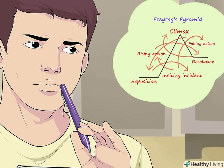 Визначте ділянки в графіку сюжету.Одним з найбільш традиційних способів структурування історії є трикутний графік, також відомий як піраміда Фрейтага. Піраміда Фрейтага розбита на шість частин: експозиція, зав'язка, розвиток дії, кульмінація, падаюче дію і розв'язка. Графік виглядає як трикутник або піраміда, де в нижній частині трикутника знаходиться експозиція, за якою слід наростання зав'язки і розвитку дії. Вершина трикутника-це кульмінація історії, а після неї йде спадний нахил падаючого дії і вирівнювання трикутника (розв'язка).[1][2]- Подібний вид сюжетного графіка часто використовується при роботі над романами, щоб структурувати дію історії. Це корисний спосіб переконатися, що в роботі зібрані всі необхідні елементи. Багато читачів позитивно реагують на текст, побудований на основі сюжетного графіка з підйомом і падінням.