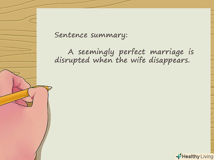 Напишіть короткий зміст в одне речення.метод сніжинки переважно використовується для структурування романів, але він так само корисний і для коротких оповідань. Цей метод дозволяє поетапно опрацювати сюжет історії і структурувати необхідні сцени в електронній таблиці. Для цього придумайте короткий зміст історії довжиною в одне речення. Воно повинно представити читачеві вашу історію і підкреслити загальний зміст.[11]- Опис має бути коротким і простим, без розлогих описів і незрозумілих термінів. Спробуйте вкластися в 15 слів або менше і зосередьтеся на тому, щоб зв'язати основну тему з діями персонажа.