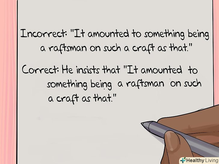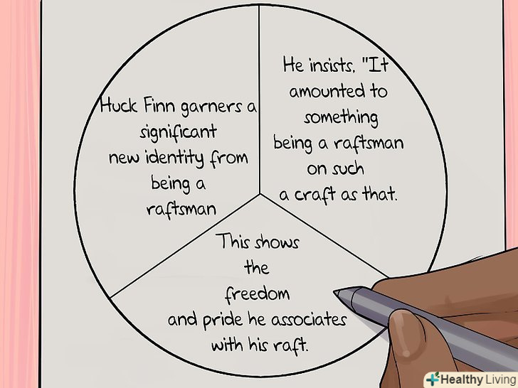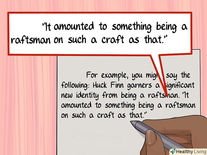 Використовуйте метод "PIE".використання методу PIE (від англ. Point, Illustration, Explanation, тобто «висловлювання, ілюстрація, пояснення») означає, що ви візьмете собі за правило проілюструвати цитатою і пояснити, яким чином цитата підтверджує ваше висловлювання.[6]- Наприклад, ви могли б сказати наступне: Гек Фінн починає відчувати себе як особистість після того як стає плотовщиком. Він наполягає:»це чогось варто бути плотовщиком на такому плоту як цей". Це-демонстрація почуття свободи і гордості, які він пов'язує зі своїм плотом.
