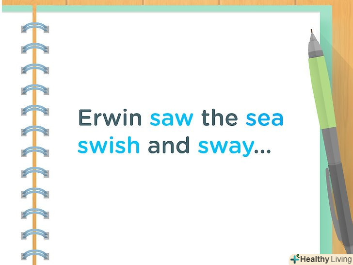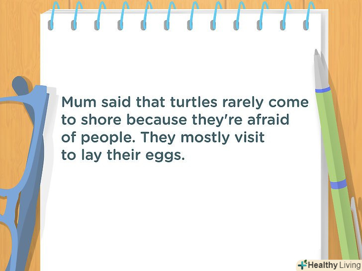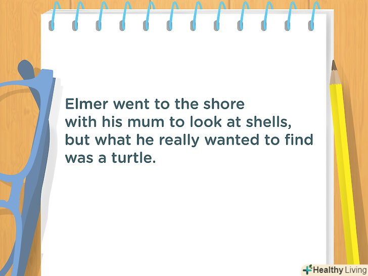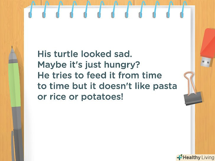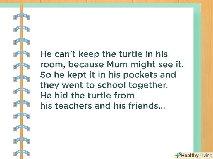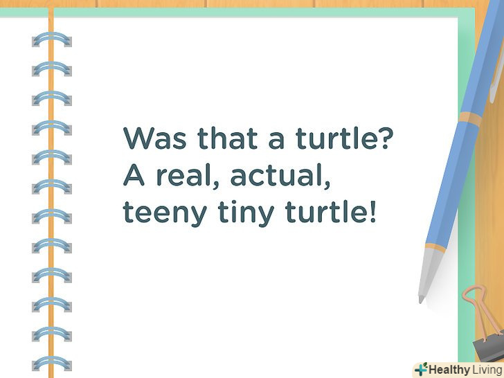 Додайте алітерацію, метафору та порівняння.алітерація-це прийом, в якому кожне слово починається з одного і того ж приголосного звуку, наприклад, «Горила грізно говорила» або «тривожиться Тарас, тужить». Це цікавий спосіб додати ритм до письма та зробити історію розважальною для дітей.[11]- Метафора-це порівняння двох речей. Наприклад, можна додати таку метафору, як: «Черепаха — це зелена черепашка, плаваюча по озеру».